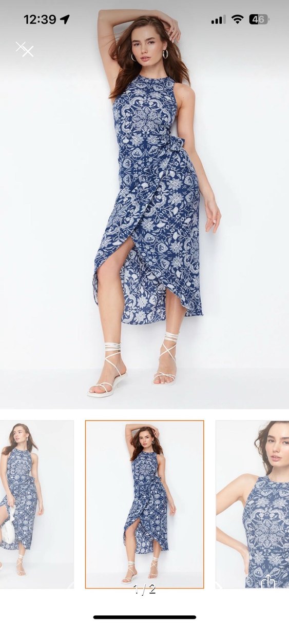 Açık mavi denim kumaştan, bağlamalı desenli, straplez yaka ve dökümlü tasarıma sahip, salaş kesim uzun bohem elbise. Romantik akşamlar için uygun.