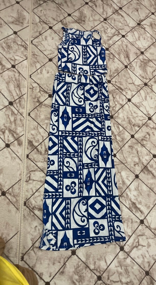 Mavi bağlamalı desenli uzun etek crop, kayık yaka ve ince askılıdır. Rahat kesimi ve dökümlü stiliyle bohem, retro havası taşır. Günlük kullanım için uygundur.