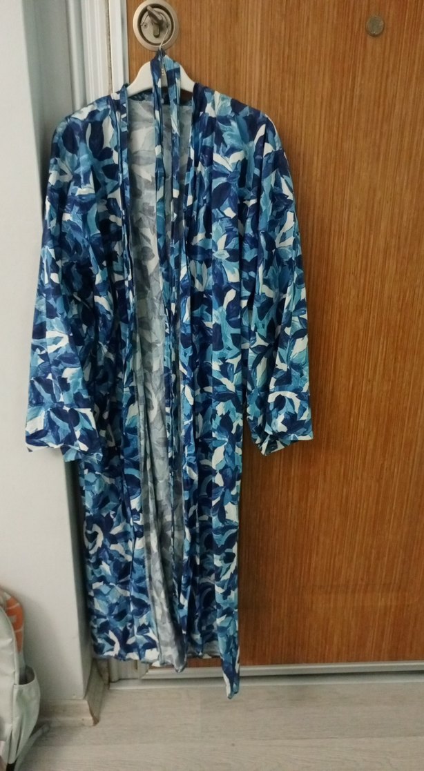 Mavi bağlamalı uzun kimono, bağlamalı ve bol kesimdir. Uzun kollu, yumuşak sentetik kumaştan yapılmış, bohem tarzına uygundur.