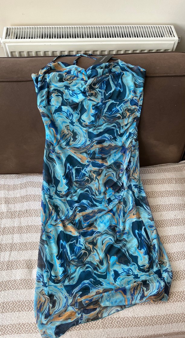 Koyu mavi bağlamalı desenli, drapeli ve straplez uzun elbise, diz altı ve bilek arasında bir yerlerde bitiyor. Bir düğün için almıştım ancak başka bir elbise beğenince bunu hiç giymedim etiketi üzerindedir