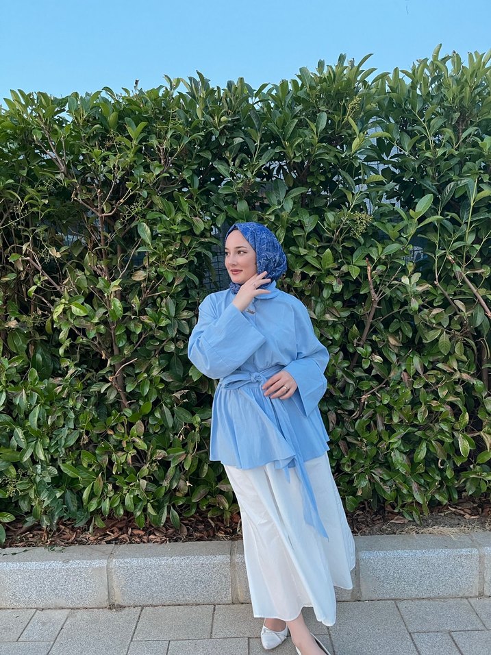 Pamuk kumaştan, yüksek yakalı ve uzun kollu, bol kesim mavi bağlamalı uzun tunik. Minimalist ve sade tarz için ideal.