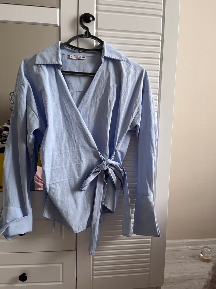 Açık mavi pamuk gömlek, v yakalı ve bol kesim. Defosuz