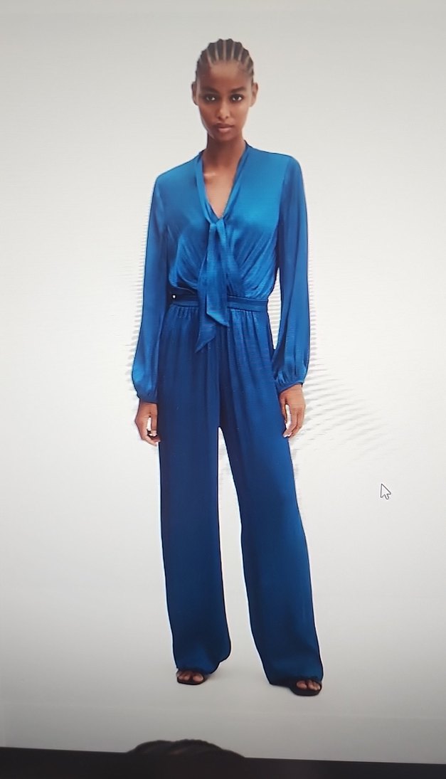 Kadınlara özel, bağlamalı beli ve uzun kollu, bol kesim uzun tulum. İpeksi kumaştan, parlak mavi batik desenli ve V yakalı, ofis için uygun.
