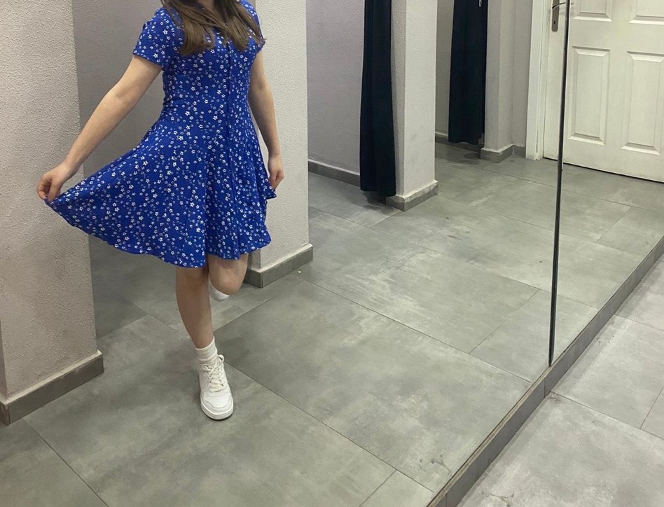 Mavi renkli, salaş kesim, V yakalı ve askılı kollu günlük elbise. Fırfır detaylı ve bağlamalı desenli, hafif sentetik kumaştan üretilmiştir.