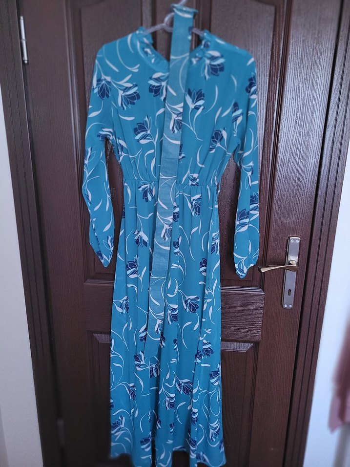 Uzun kollu, mavi bağlamalı desenli, V yaka ve dökümlü kesime sahip kadın elbisesi. Sentetik kumaştan, bohem tarzda ve rahat kalıptadır.arka bel.kisminda biraz yırtık vardır resimdede belirttim fiyati o yüzden uygun tutuyorum