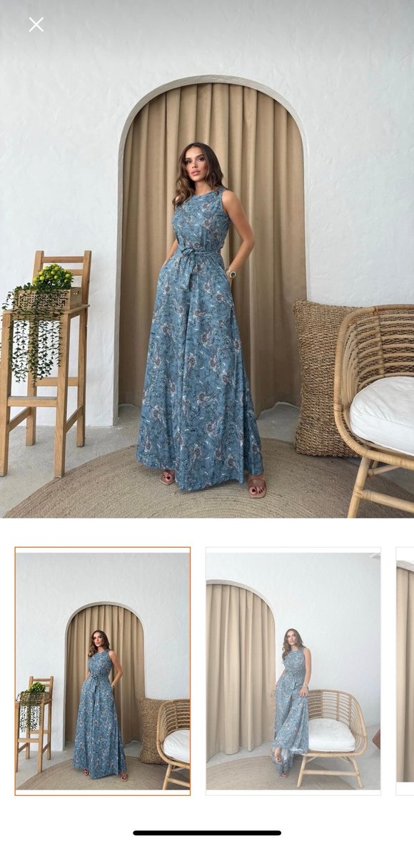 Mavi batik desenli, V yakalı, kemerli, kolsuz uzun tulum. Rahat kesimi ve bohem tarzıyla düğünler için uygun.