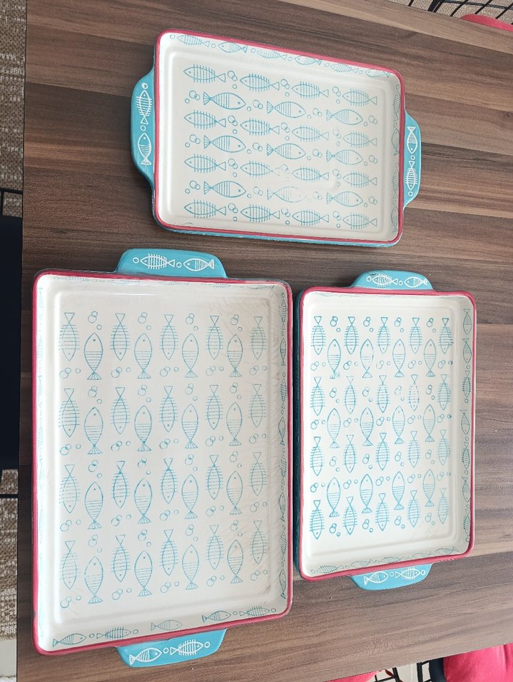 Balık desenli, mavi renkli, taşıma kulplu renkli fırın kapları seti. 3lu.Gallery cristalden alındı.bikac defa kullanildi