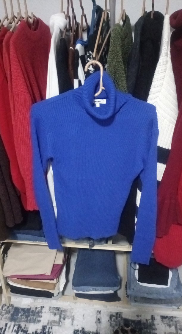 Mavi balıkçı yaka, uzun kollu ve vücuda oturan bu kazak, yumuşak ve sıcak dokuma kumaştan örülmüştür. Günlük sokak stili için uygundur.