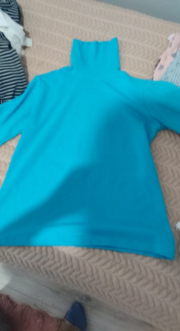 Mavi renkli, balıkçı yaka ve uzun kollu, vücuda oturan kadın triko kazak. Yumuşak ve sıcak dokulu, günlük rahat stil için uygun.