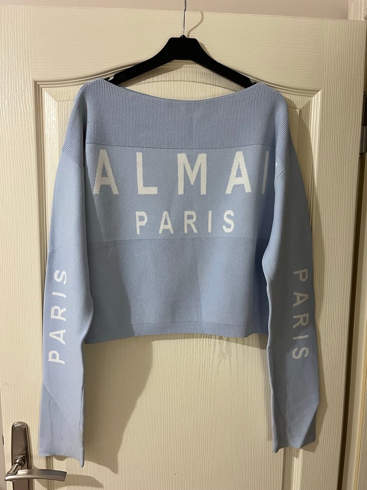 Pastel mavi renkli, uzun kollu, yuvarlak yakalı, bol kesim kadın kazak. Yumuşak ve sıcak dokuma kumaştan, baskılı "PARIS" ve "BALMAIN" detaylıdır.