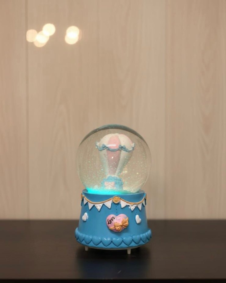 Mavi kar küresi içinde renkli sıcak hava balonu figürü, dekoratif detaylar ve ışıklı taban ile süslenmiştir.