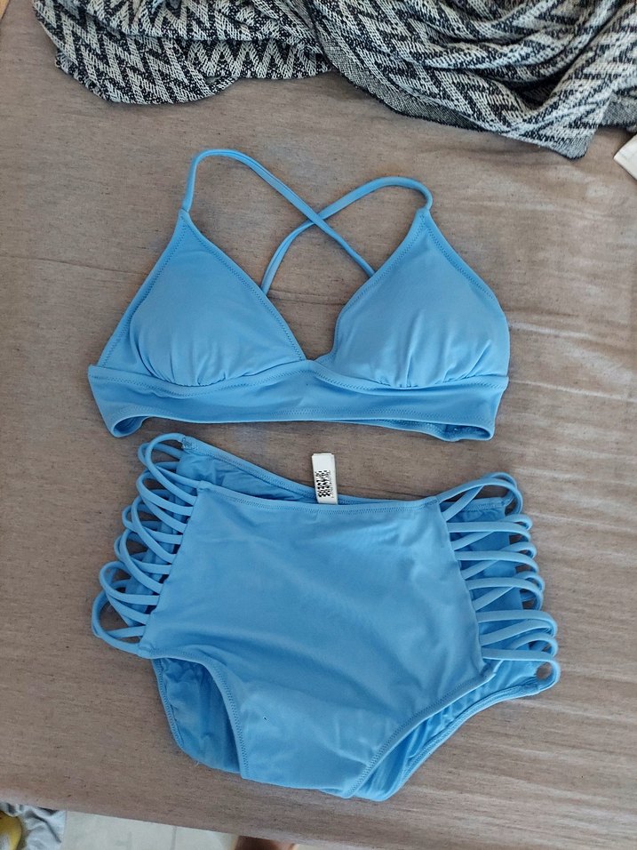 Pastel mavi renkte, bant detaylı mini bikini takımı. Üst kısmı askılı, alt kısmı yanları bantlı, bohem ve şık bir tarz sunar.