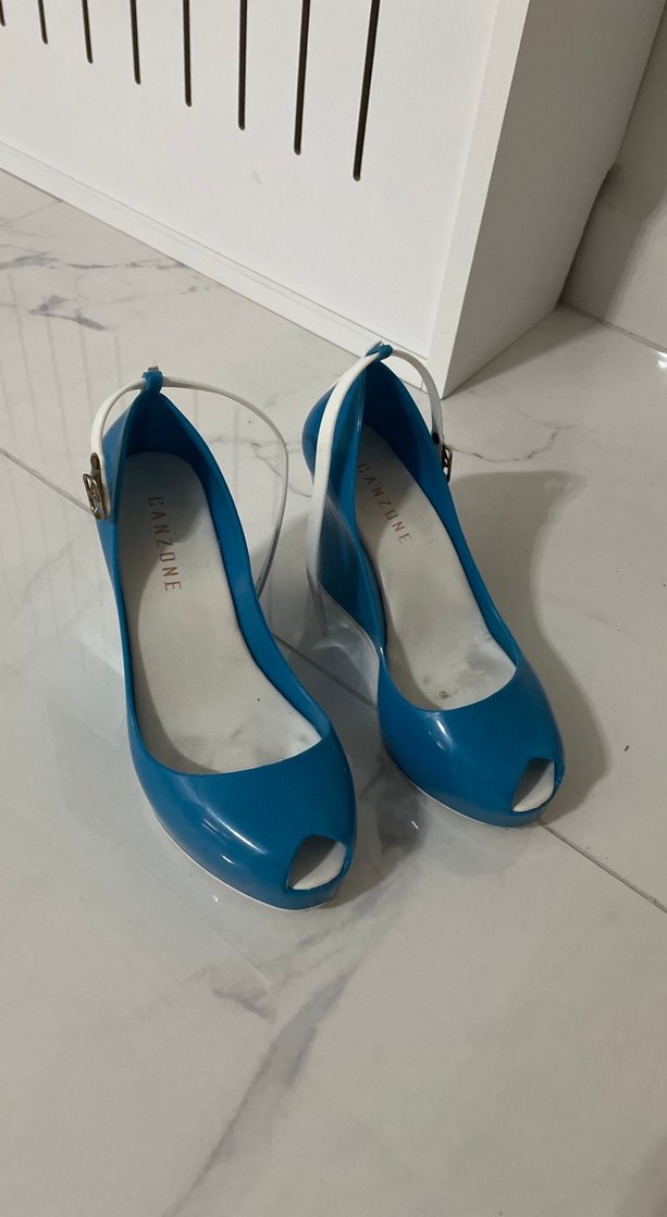 Pastel mavi renkte, beyaz tokalı bantlı, kauçuk malzemeden yapılmış dolgu topuk ayakkabılar. Minimalist ve çağdaş tasarıma sahip.