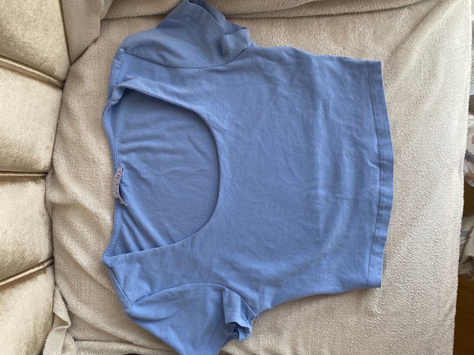 Mavi denim kumaştan, kısa kollu, bisiklet yaka ve kısa boyda, sade ve günlük kullanıma uygun tişört