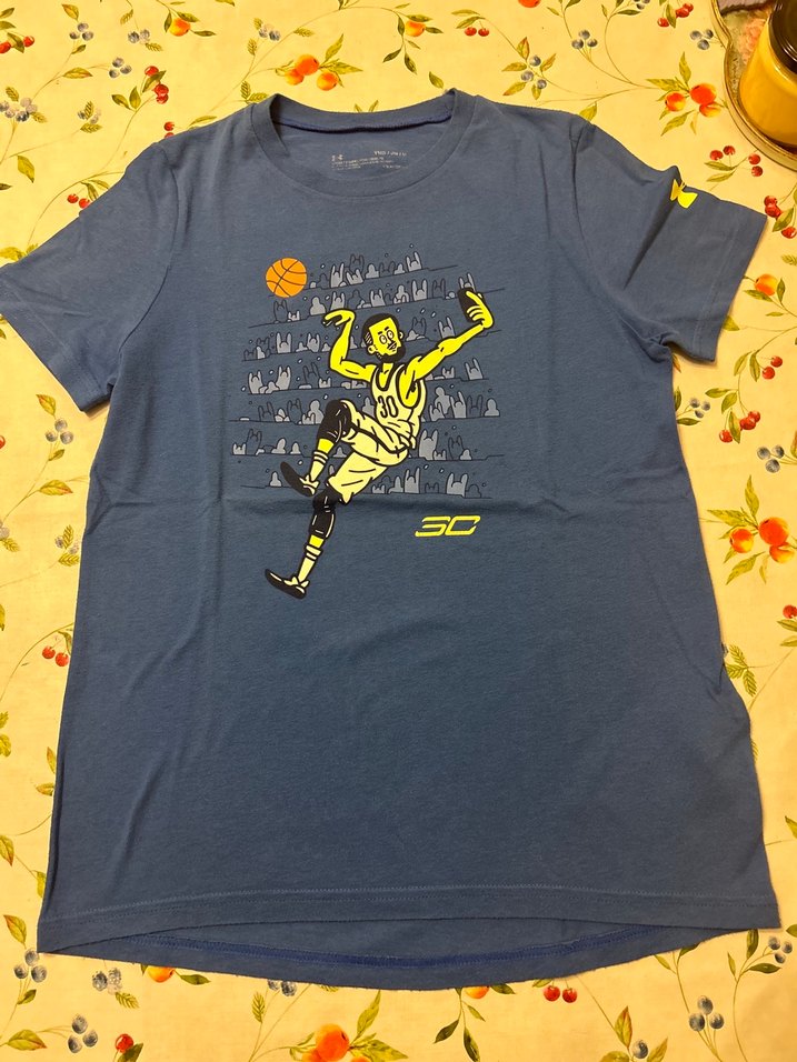 Mavi renkli, kısa kollu, bisiklet yaka ve bol kesime sahip erkek çocuk tişörtü. Önünde baskılı basketbol oyuncusu figürü bulunur. Denim kumaştan üretilmiştir, sokak stili için uygundur. Under Armour markadır