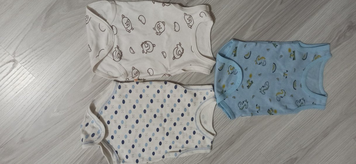 Yumuşak pamuktan yapılmış, askısız ve düğmeli bebek bodyleri. Pastel mavi renklerde, eğlenceli baskılı desenlere sahip.