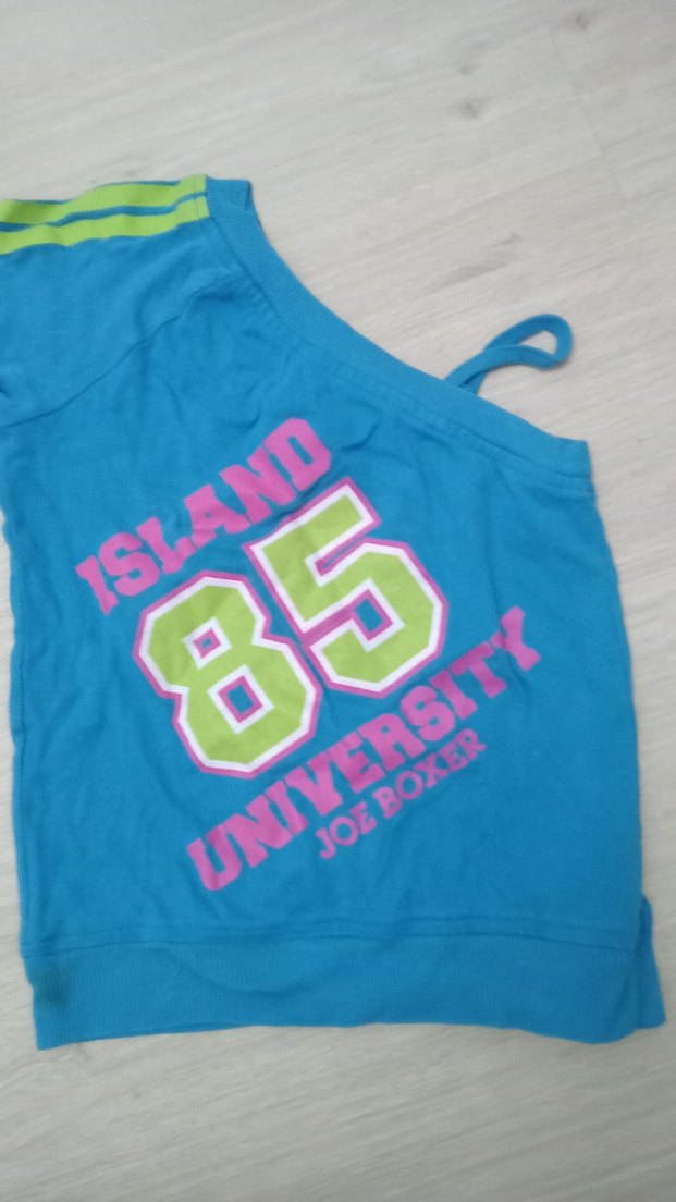 Pamuklu, mavi renkli, askısız ve salaş kesim kız tişörtü. Üzerinde renkli baskılar ve '85', 'ISLAND', 'UNIVERSITY' yazıları bulunur. Trendy rahat stil için uygundur.