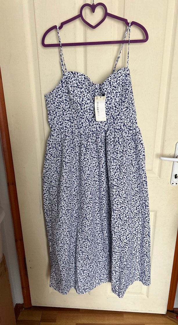 Pamuk kumaştan, askısız ve düğmeli, bol kesim mavi baskılı midi elbise. Rahat ve günlük kullanıma uygun. Bana bol geldiği için satmak istiyorum.