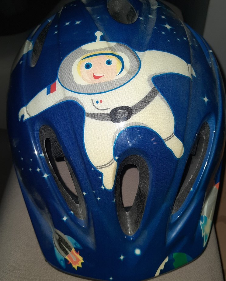 Mavi plastik motosiklet kaskı, renkli astronot baskısı ve tokalı yapısıyla avant-garde tarzı ve biker işlevselliğini birleştirir.