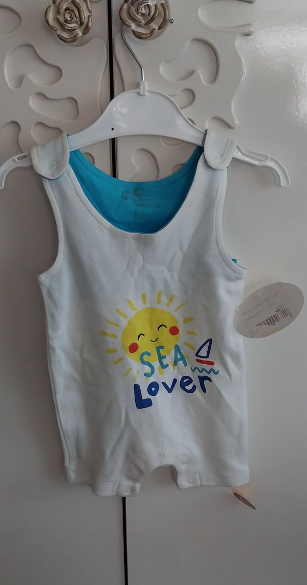 Açık mavi renkli, alt kısmında çıtçıtlı, üzerinde neşeli güneş ve deniz temalı "Sea Lover" baskısı bulunan bebek atlet body. ☀️