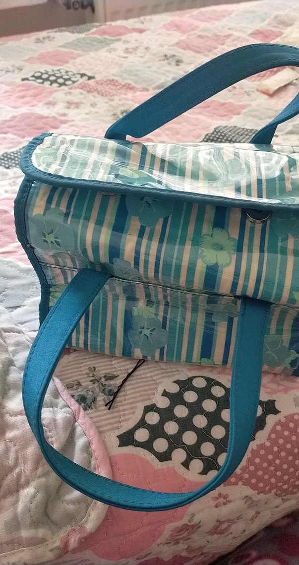 Pastel mavi renkte, çiçek ve çizgili desenli bebek çantası, taşıma için sağlam saplara sahiptir.