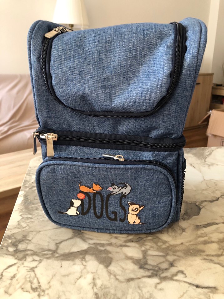 Mavi renkli bebek çantası, çoklu fermuarlı bölmeler ve sevimli köpek desenli baskıya sahiptir, bebek malzemeleri için kullanışlıdır. Hiç kullanılmadı bebek yemeği, sıcak yemek, termos taşınabilir Soğuk meyve meşrubat taşınabilir Yanda fileler var, 3 tane gözü var her gözü folyolu Uzatma sapı vardır