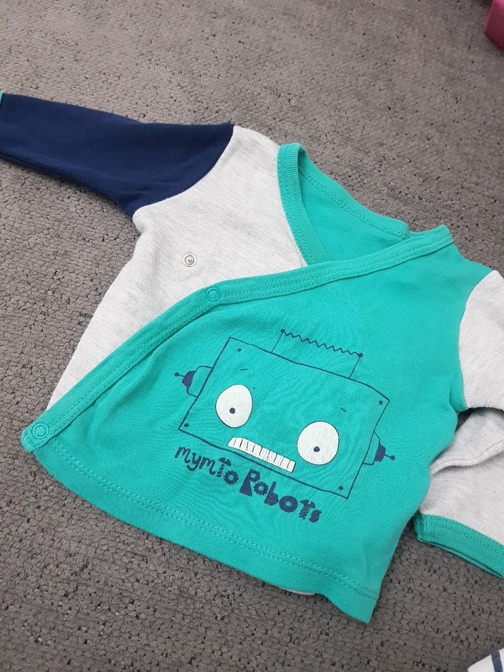 Bebek erkek uzun kollu üst, düğmeli ve baskılı robot deseniyle. Mavi, gri ve lacivert renklerde, yumuşak ve sıcak kumaştan üretilmiştir.