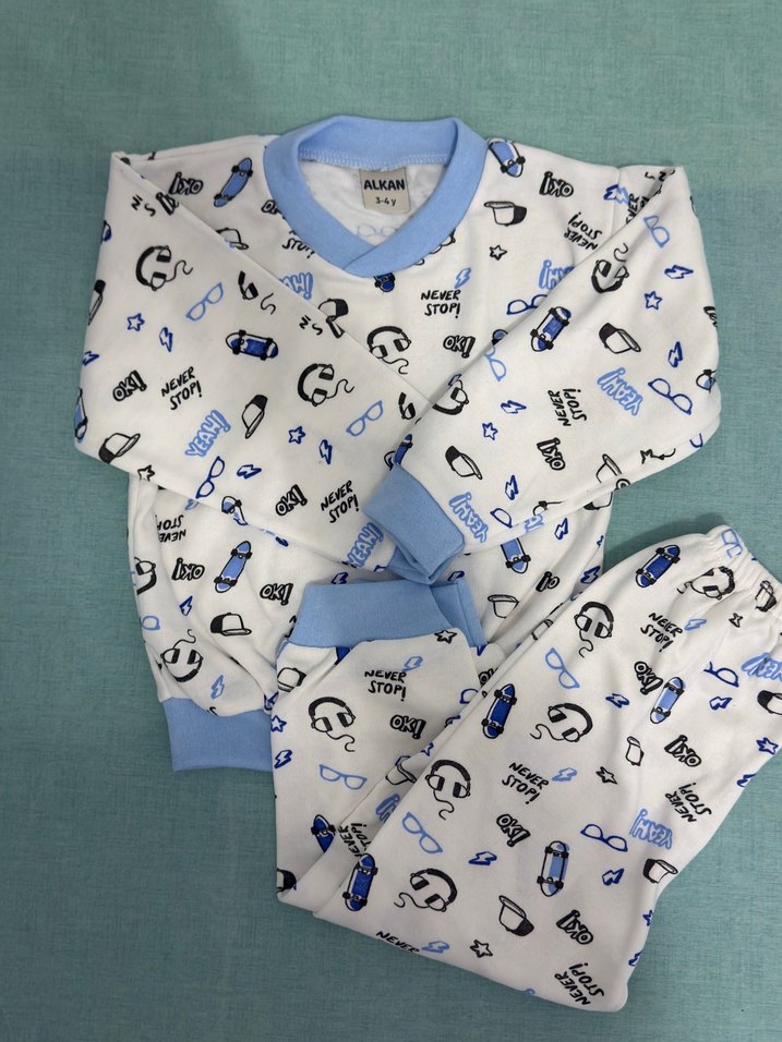 Renkli baskılı, uzun kollu ve düğmeli bebek hastane takımı. Yumuşak ve sıcak kumaştan, gözlük ve kulaklık desenli. Mavi detaylı üst ve alt set. Optik yazı: ALKAN, STOP.