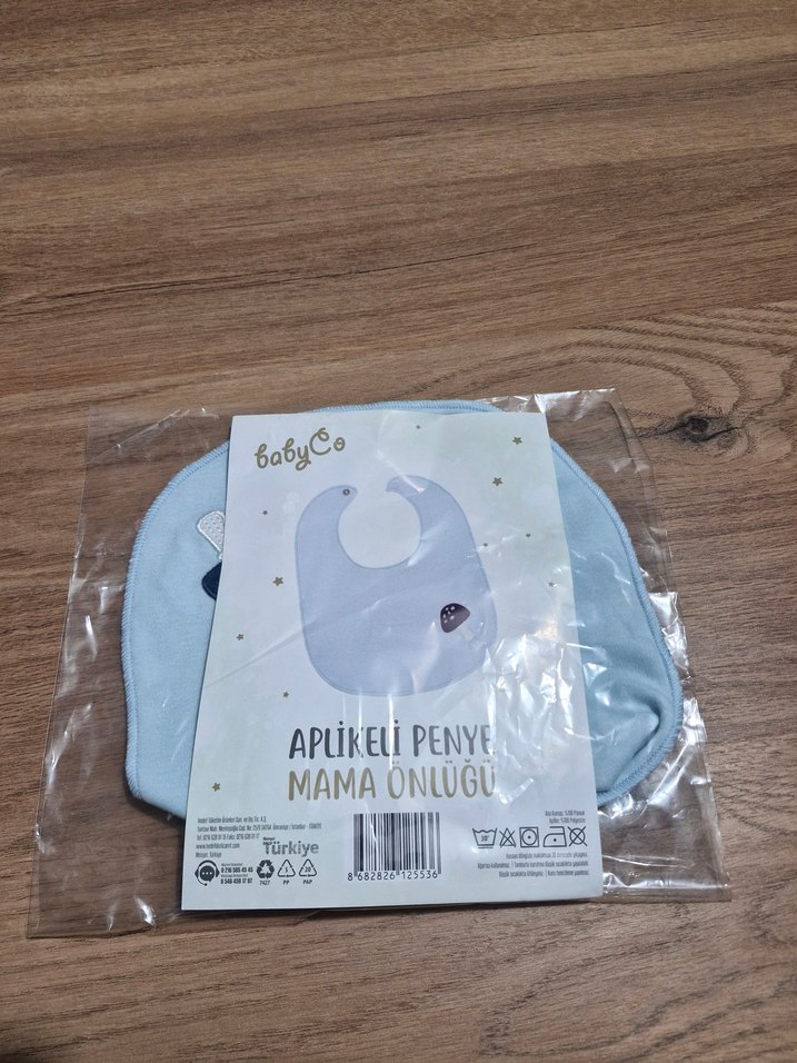 Pastel mavi renkte, baskılı desenli, yumuşak aplike pamuk kumaştan yapılmış bebek mama önlüğü. Türkiye menşeilidir.