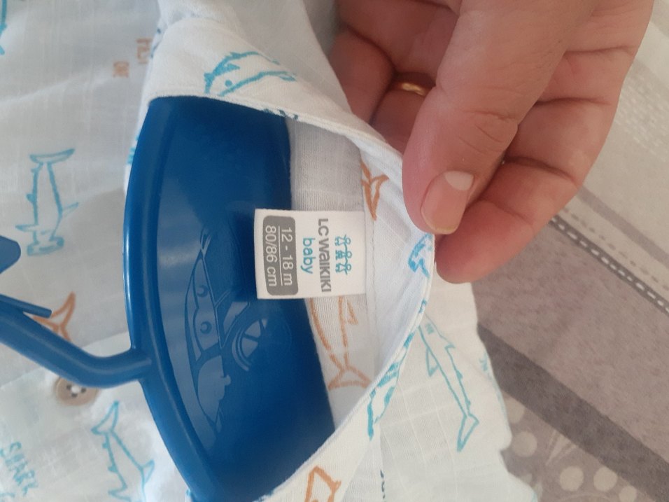 Baskılı desenli, açık mavi renkli bebek önlüğü. 12-18 ay (80/86 cm) bedenindedir. Yumuşak ve kullanışlıdır.