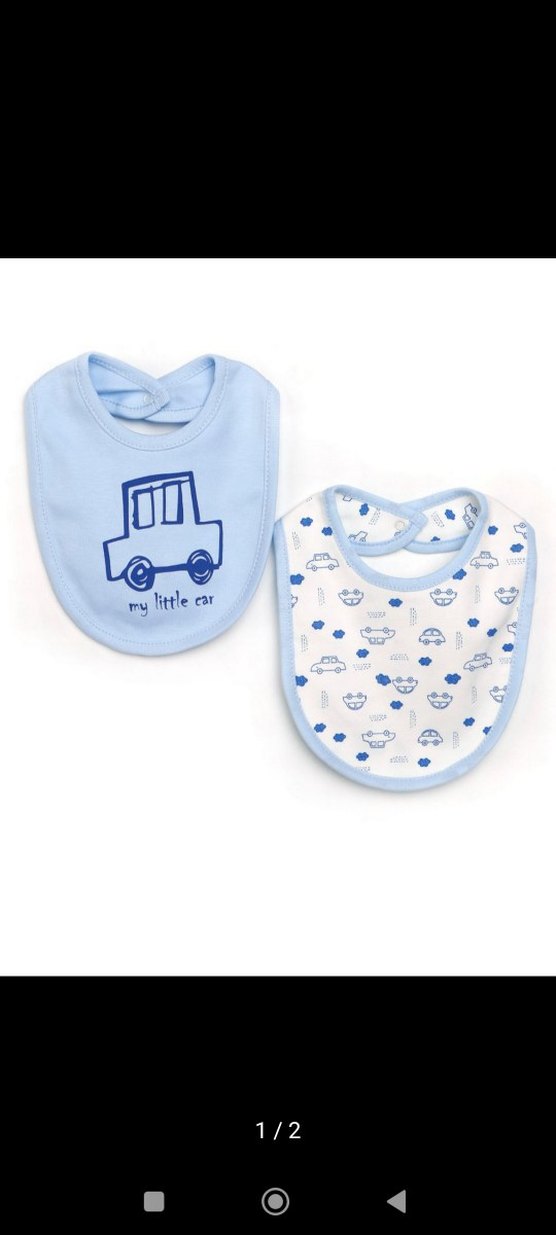 Pastel mavi renkte, baskılı araba desenli iki adet bebek önlüğü. Yumuşak kumaş ve kolay boyun kapama özelliğine sahiptir.