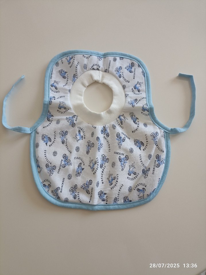 Mavi kenarlıklı ve renkli baskılı desene sahip bebek önlüğü, yumuşak boyun açıklığı ve bağlama ipleri içerir.