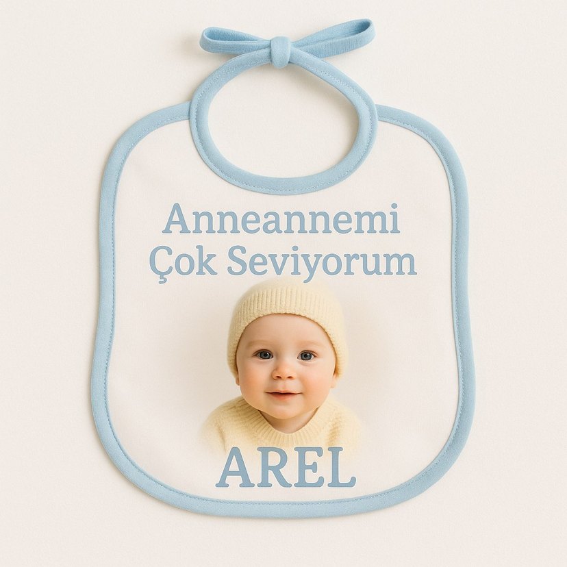 Beyaz kenarlı, baskılı "Anneannemi Çok Seviyorum" yazılı ve fotoğraflı bebek önlüğü, yumuşak kumaştan, bağlamalı model. İSTENİLEN FOTOĞRAF VE YAZI BASILIR.