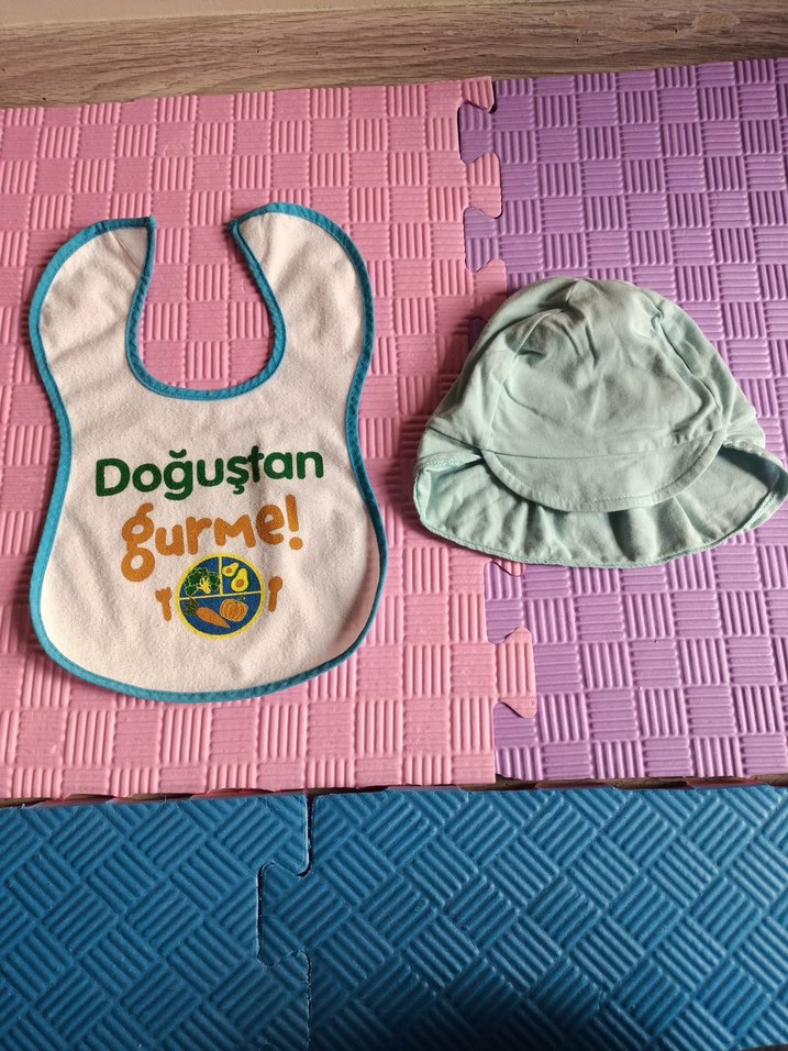 Pastel mavi renkli, "Doğuştan gurme!" yazılı baskılı bebek önlüğü. Yumuşak kumaş ve renkli kenarlık içerir. ürün her seferinde hiç kullanılmadı şapka %100 organik pamuk kulakları ve ense kısmını kapatan detayı var ön kısmında da kısa bir gölgeliği mevcut