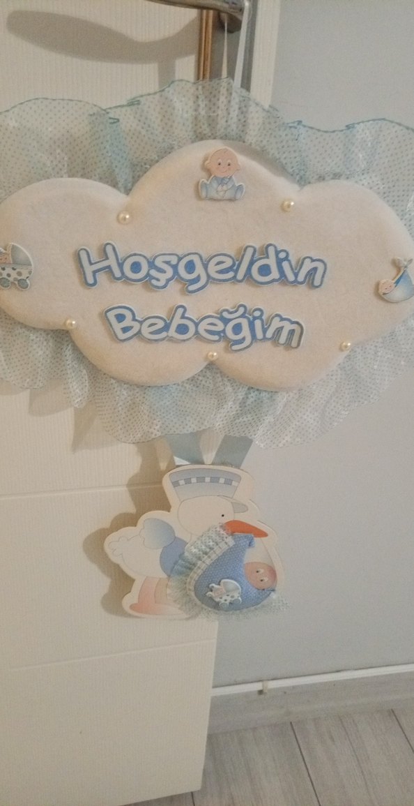 Pastel mavi renkli, baskılı "Hoşgeldin Bebeğim" yazılı bebek önlüğü. Yumuşak kumaş ve dekoratif detaylar içerir.