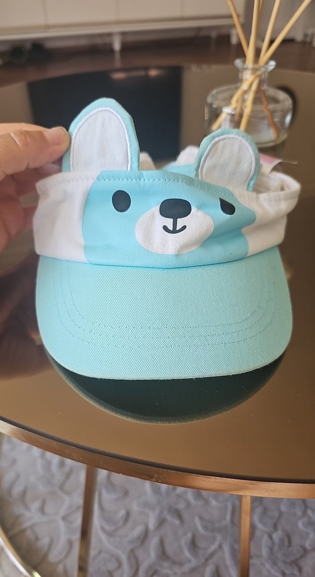 Pastel mavi renkli, baskılı ayı yüzü desenli, kulak detaylı yumuşak bebek şapka. Rahat ve kullanışlıdır.