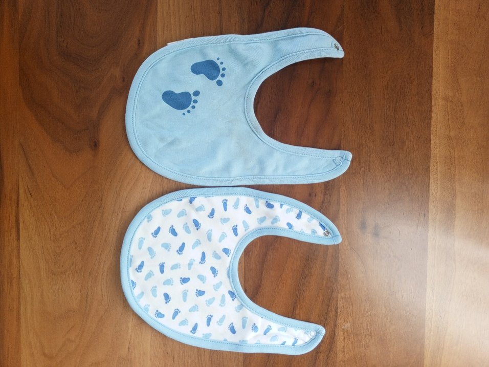 Pastel mavi renkte, baskılı ayak izleriyle süslenmiş iki adet bebek önlüğü seti. Biri düz mavi, diğeri beyaz zemin üzerinde mavi ayak izleri ile.