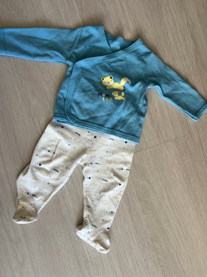 Mavi uzun kollu, düğmeli ve baskılı üst ile beyaz desenli pantolon içeren yumuşak ve sıcak kumaştan bebek takımı.