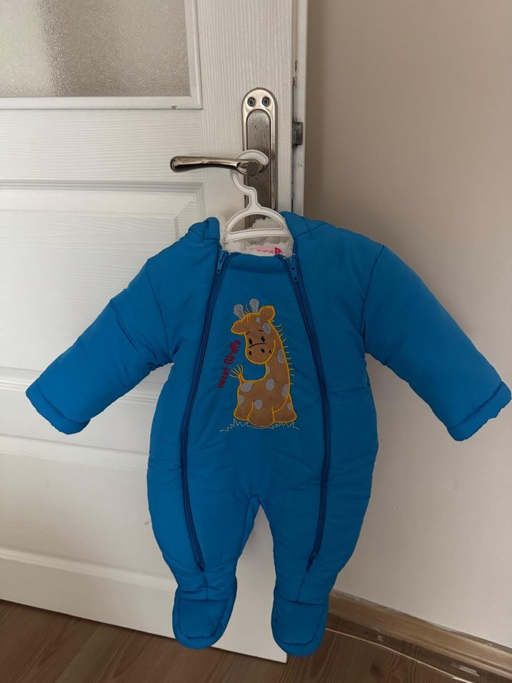 Mavi renkli, baskılı zürafa desenli ve tokalı, yumuşak ve sıcak kumaştan yapılmış bebek tulumu. ❄️ 3/9 ay uygundur hiç kullanılmadı