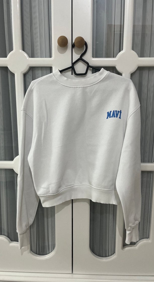 Beyaz, uzun kollu, yuvarlak yaka, bol kesim kadın sweatshirt. Üzerinde MAVI baskısı bulunur, yumuşak ve sıcak kumaştan yapılmıştır. Orjinal magzdan alınmıstır