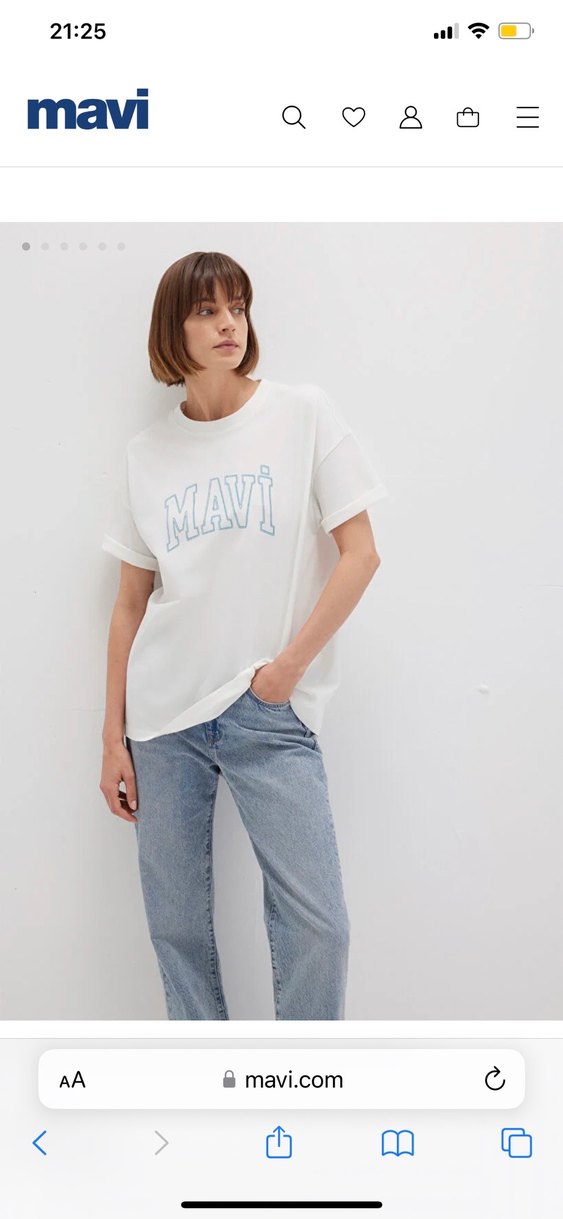 Beyaz renkli, kısa kollu ve yuvarlak yaka kadın tişörtü. Denim kumaştan üretilmiş, pastel tonlarda 'MAVI' baskısı bulunur. Rahat ve salaş kesim, günlük kullanıma uygun.