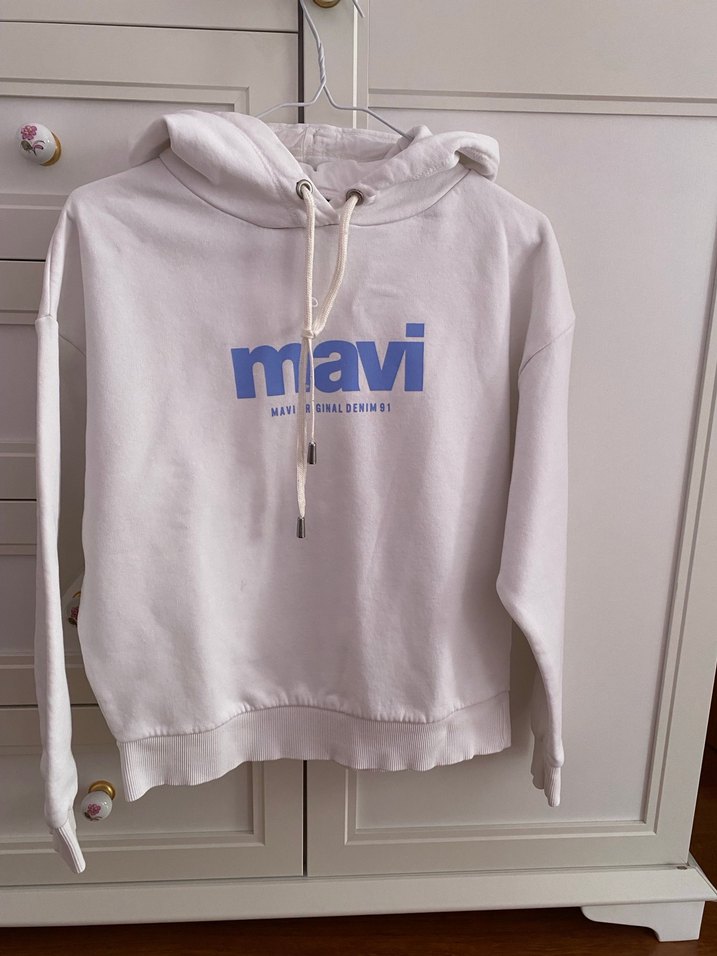 Beyaz kapüşonlu sweatshirt, bol kesim ve uzun kollu, önünde pastel mavi "mavi" baskısı bulunur. Yumuşak ve sıcak kumaştan, günlük rahat kullanım için uygundur.