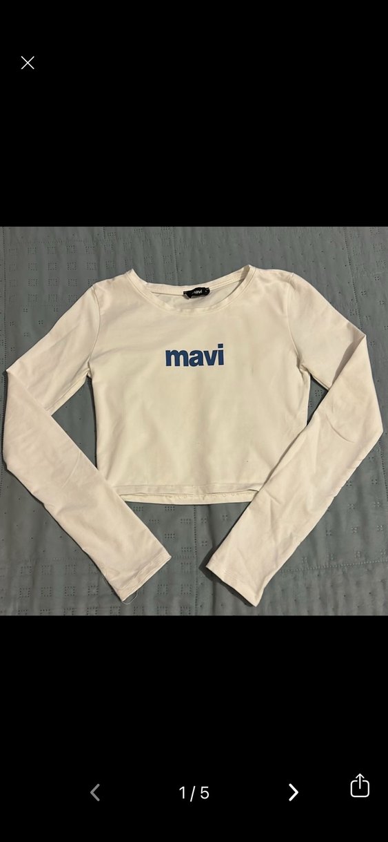 Pamuklu kumaştan, fitted kesim beyaz uzun kollu kadın tişört. Önünde mavi baskılı 'mavi' yazısı bulunur, gündelik sokak stiline uygun.