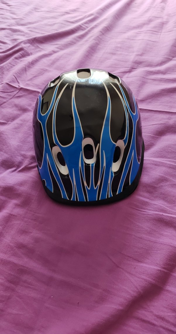 Mavi baskılı alev desenli plastik biker kask, velcro bantlı. Koyu renk, grunge punk tarzında rock punk havası verir. ️ Bisiklet kaskı