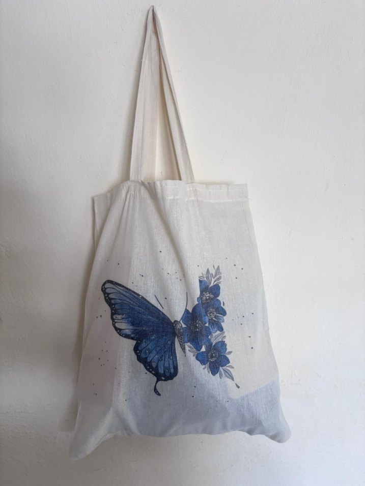 Mavi baskılı, hafif sentetik kumaştan yapılmış, boncuk detaylı, minimalist ve bohem tarzına uygun kadın çantası.