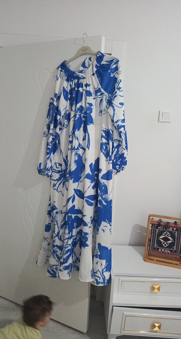 Mavi-beyaz baskılı uzun elbise, bol kesim ve drapeli tasarıma sahip, straplez yaka ve uzun kolludur, günlük kullanım için uygundur.