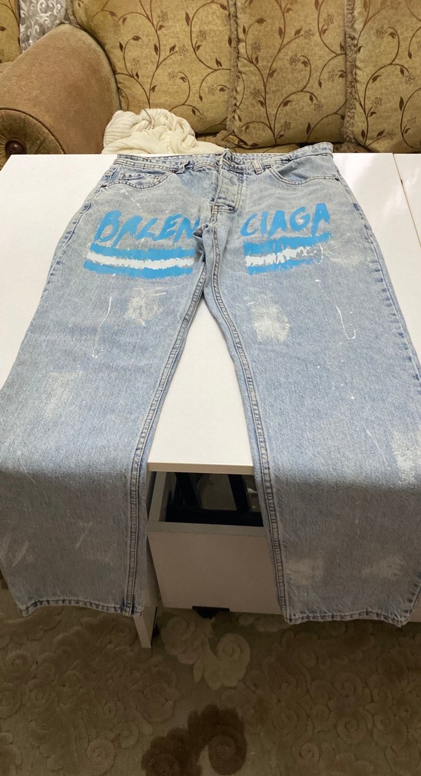 Bol kesim, baskılı desenli mavi kot pantolon, tokalı detaylı, midi boy ve gri tonlarında, günlük rahat sokak stili için uygundur. Bel 40 basen 56 boy 100 cm