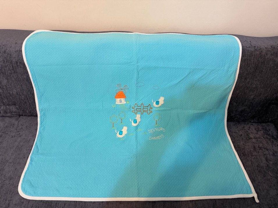 Çift katlı kalın penye bebek battaniyesi kusuru yok Yumuşak sentetik kumaştan yapılmış, ev, çit ve kuş desenli pastel mavi çocuk battaniyesi.