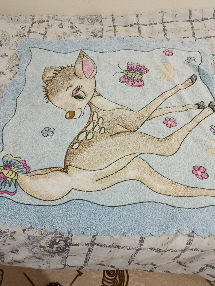 Yumuşak ve sıcak dokulu, pastel mavi renkte, geyik ve kelebek baskılı çocuk battaniyesi.