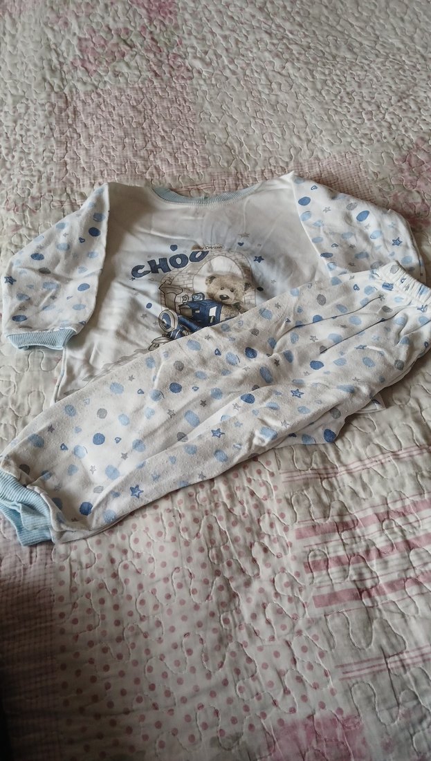 Çocuklar için yumuşak ve sıcak kumaştan yapılmış, pastel mavi renkli ve baskılı desenlere sahip pijama takımı.